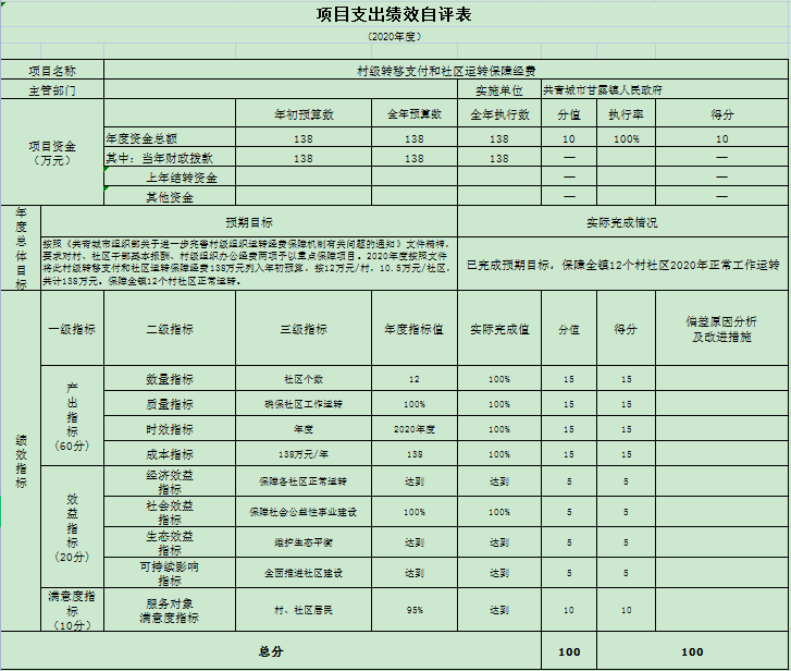 村级转移支付和社区运转保障经费项目绩效自评得分为100分。项目全年预算数为138万元,执行数为138万元,完成预算的100%。项目绩效目标完成情况:已完成预期目标,保障全镇12个村社区2020年正常工作运转。