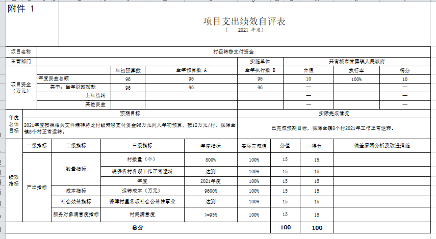 将2021年甘露镇部门绩效自评总报告和《项目支出绩效自评表》(自选2个项目)进行公开。