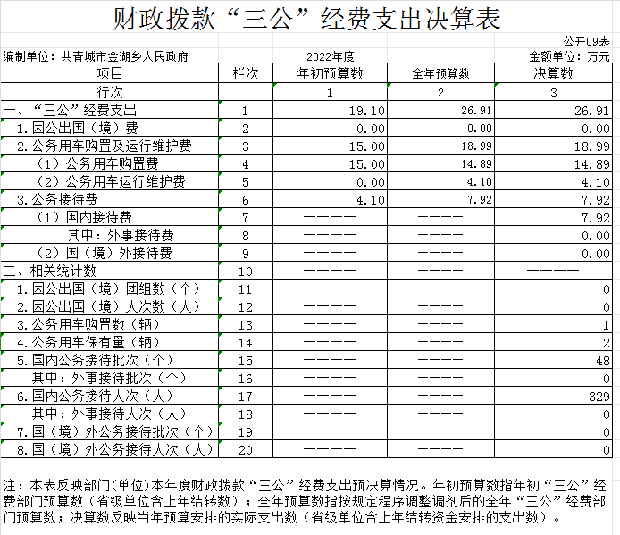(十)“三公”经费支出:指用一般公共预算财政拨款安排的因公出国(境)费、公务用车购置及运行维护费和公务接待费。其中,因公出国(境)费反映单位公务出国(境)的国际旅费、国外城市间交通费、住宿费、伙食费、培训费、公杂费等支出;公务用车购置及运行维护费反映单位公务用车车辆购置支出(含车辆购置税、牌照费),按规定保留的公务用车燃料费、维修费、过桥过路费、保险费、安全奖励费用等支出;公务接待费反映单位按规定开支的各类公务接待(含外宾接待)支出。