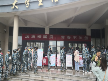 活动主要分为两个部分,第一部分是在大学生活动中心门口,各单位采取在校内摆放宣传展板、悬挂宣传横幅、发放安全常识宣传品、讲解法律常识等多种形式进行宣传教育。工作人员耐心细致解答学生们提出的相关问题并讲解相关安全常识,并向师生发放防范非法校园贷、 “套路贷”宣传资料和“抵制校园贷倡议书”。
