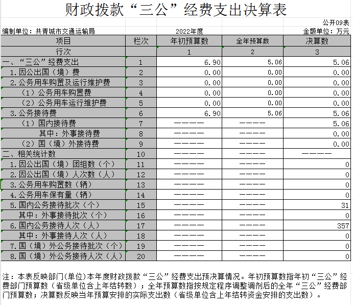 (五)“三公”经费支出:指用财政拨款安排的因公出国(境)费、公务用车购置及运行维护费和公务接待费。其中,因公出国(境)费反映单位公务出国(境)的国际旅费、国外城市间交通费、住宿费、伙食费、培训费、公杂费等支出;公务用车购置及运行维护费反映单位公务用车车辆购置支出(含车辆购置税、牌照费),按规定保留的公务用车燃料费、维修费、过桥过路费、保险费、安全奖励费用等支出;公务接待费反映单位按规定开支的各类公务接待(含外宾接待)支出。