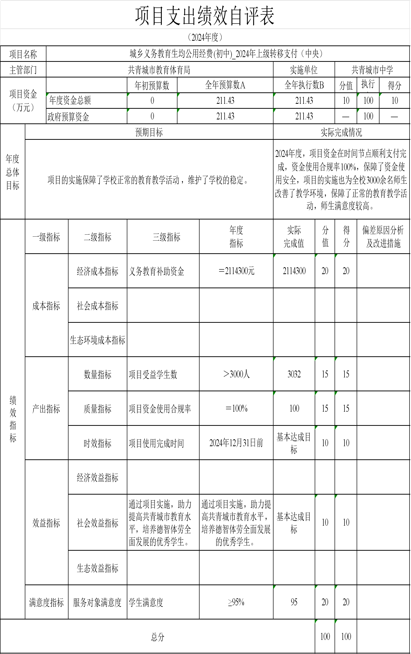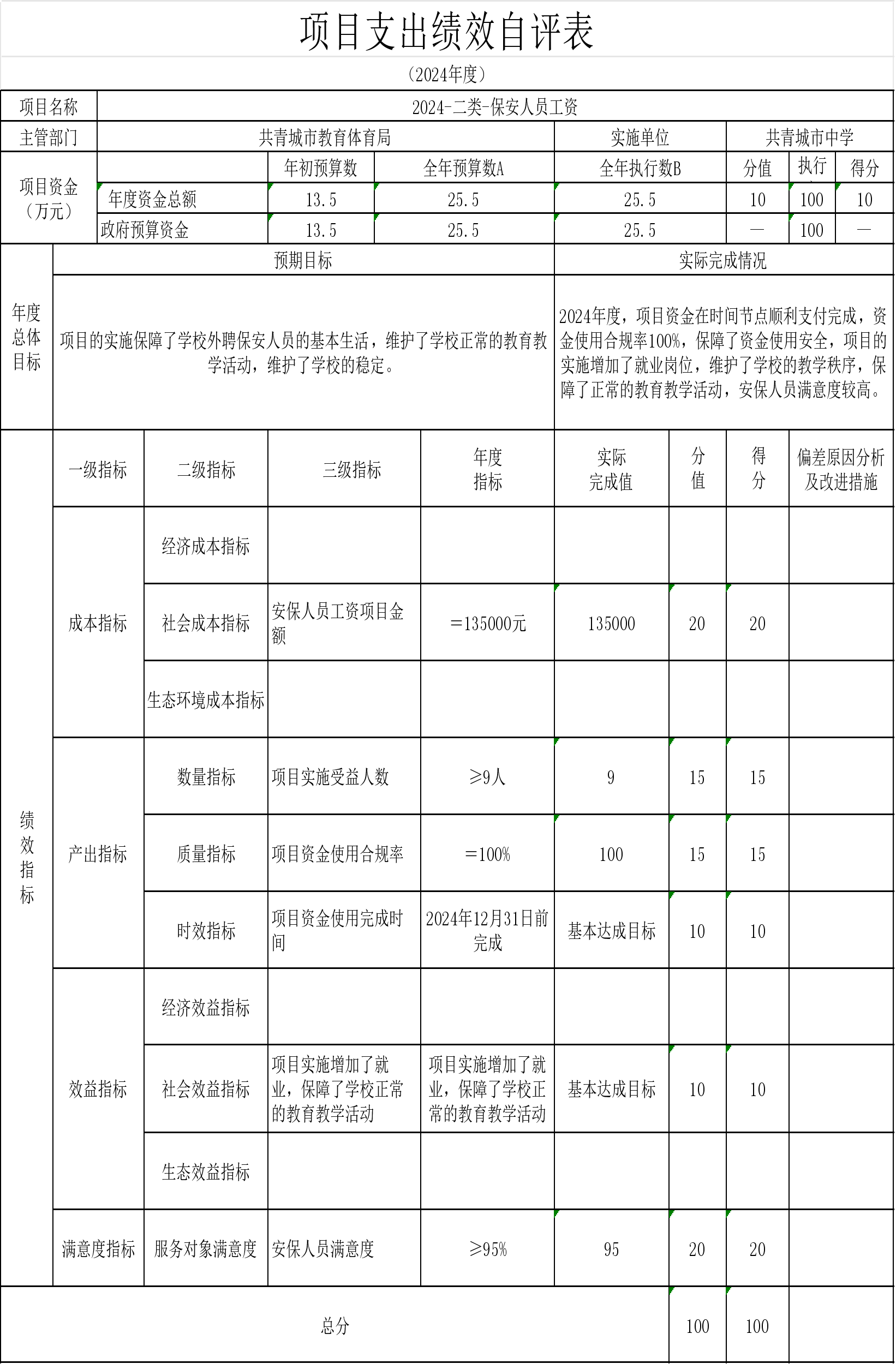 本单位“2024-二类-保安人员工资”“城乡义务教育生均公用经费(初中)_2024年上级转移支付(中央)”等项目支出绩效自评结果如下: