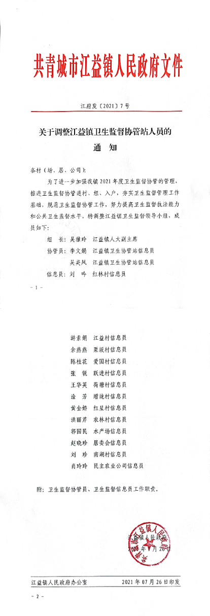 关于调整江益镇卫生监督协管站人员的通知
