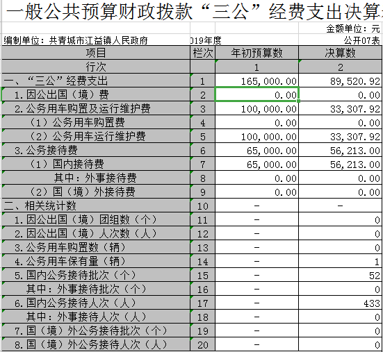 (二)公务接待费支出年初预算数为6.5万元,决算数为5.6万元,完成预算的86.15%,决算数较2018年减少0.66万元,下降10.54%。决算数较年初预算数减少的主要原因是:招商引资及公务接待减少。