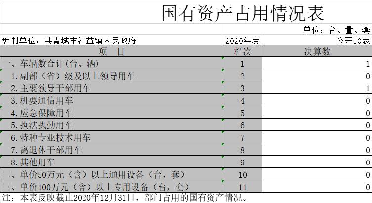 截至2020年12月31日,本部门(单位)国有资产占用情况见公开10表《国有资产占用情况表》。其中车辆中的主要领导干部用车1辆。