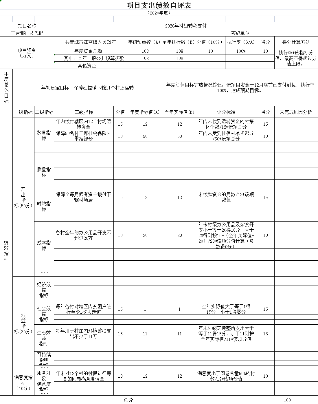 村级转移支付项目绩效自评综述:根据年初设定的绩效目标,村级转移支付项目绩效自评得分为100分。项目全年预算数为108万元,执行数为108万元,完成预算的100%。主要产出和效果:较好的保障了下辖10个行政村运行。发现的问题及原因:乡镇财政收支有所好转,但保运转保发展的压力依然存在。下一步改进措施:加大对农村公益事业投入,促进农村经济发展。