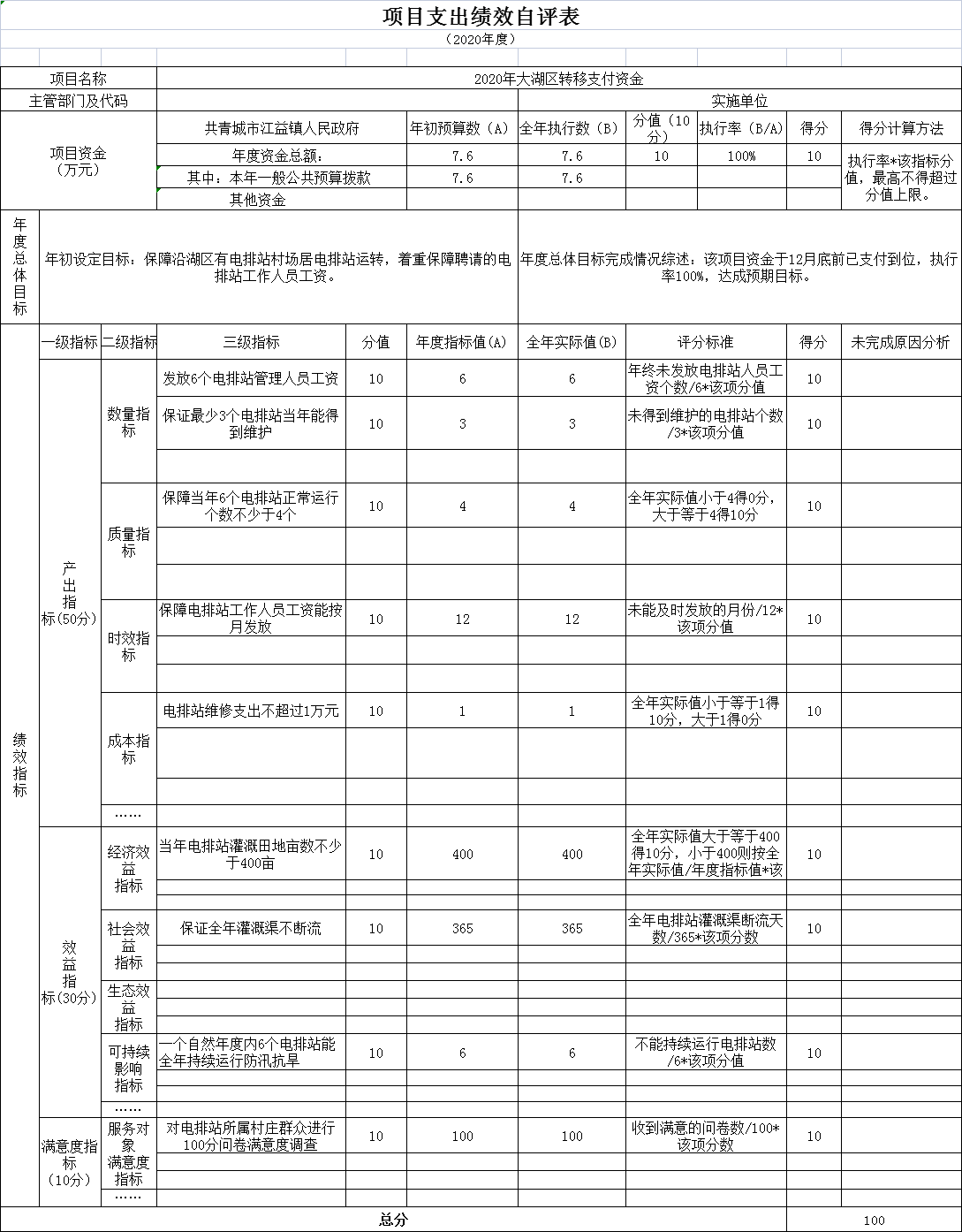 太湖区财政转移支付项目绩效自评综述:根据年初设定的绩效目标,太湖区财政转移支付项目绩效自评得分为100分。项目全年预算数为7.6万元,执行数为7.6万元,完成预算的100%。主要产出和效果:维持了辖区内6个电排站的运转。发现的问题及原因:个别排涝泵站存在设备老化的问题。下一步改进措施:加强对排涝电站的日常维护管理工作。
