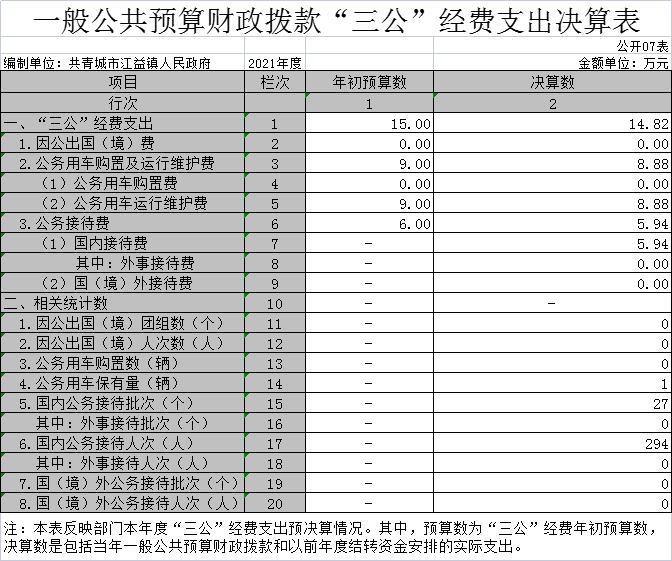 (六)“三公”经费支出:指用一般公共预算财政拨款安排的因公出国(境)费、公务用车购置及运行维护费和公务接待费。其中,因公出国(境)费反映单位公务出国(境)的国际旅费、国外城市间交通费、住宿费、伙食费、培训费、公杂费等支出;公务用车购置及运行维护费反映单位公务用车车辆购置支出(含车辆购置税、牌照费),按规定保留的公务用车燃料费、维修费、过桥过路费、保险费、安全奖励费用等支出;公务接待费反映单位按规定开支的各类公务接待(含外宾接待)支出。
