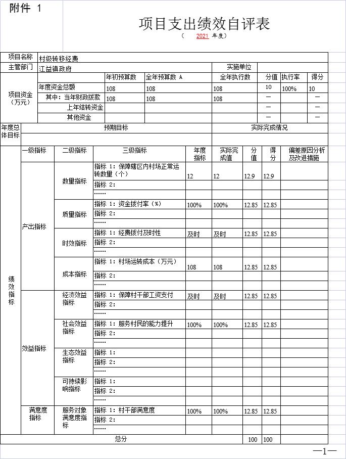 村级转移支付项目绩效自评综述:根据年初设定的绩效目标,村级转移支付项目绩效自评得分为100分。项目全年预算数为108万元,执行数为108万元,完成预算的100%。主要产出和效果:较好的保障了下辖10个行政村运行。发现的问题及原因:乡镇财政收支有所好转,但保运转保发展的压力依然存在。下一步改进措施:加大对农村公益事业投入,促进农村经济发展。