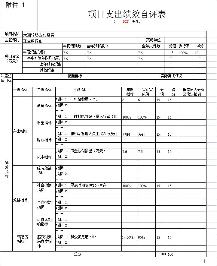 太湖区财政转移支付项目绩效自评综述:根据年初设定的绩效目标,太湖区财政转移支付项目绩效自评得分为100分。项目全年预算数为7.6万元,执行数为7.6万元,完成预算的100%。主要产出和效果:维持了辖区内6个电排站的运转。发现的问题及原因:个别村排涝泵站存在设备老化的问题。下一步改进措施:加强对排涝电站的日常维护管理工作。