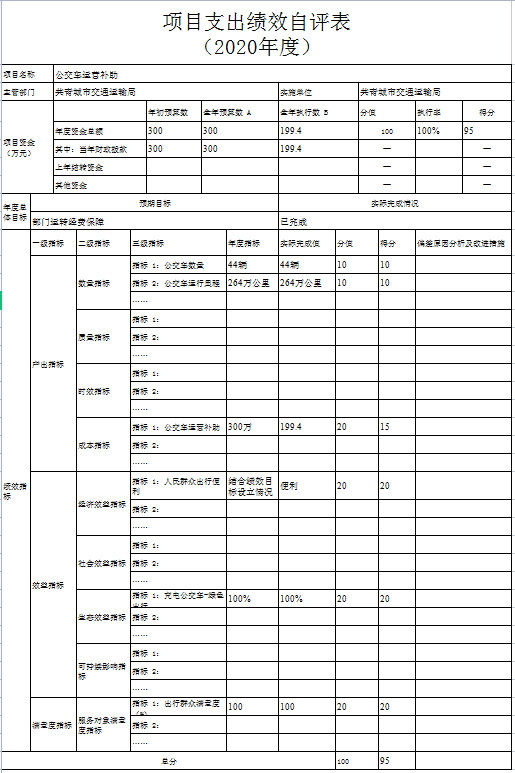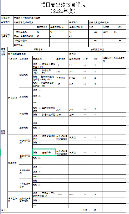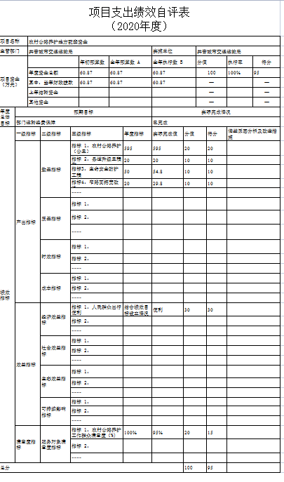 根据年初设定的绩效目标,预算项目、部门整体支出项目绩效自评得分为97分。项目全年预算数为627.17万元,执行数为526.57万元,完成预算的83.96%。项目绩效目标完成情况:一是今年我市涉及交通基础设施的新建、续建项全年完成公路建设总投资3.2亿元,窄路面扩宽项目完成5公里,生命安全防护工程完成20公里,完成危桥改造3座,完成资源路产业路10.2公里。1.苏青公路路灯安装加班加点提前完工;2.省重点项目G532三期已完成整个项目75%;3.黄金线公路已竣工并交付使用;4.南新公路项目有力推进,江益集镇段改造完成;5.关斜线、泽泉集镇段改造已完工并交付使用;6.治超治限检测站已竣工,春节前后可入驻并投入使用;7.江益镇红星圩堤路面拓宽工程抢抓晴好天气可于年底前完成全部土方工程;8.综合场至金湖项目实干加巧干,项目自4月底开工以来已完成土方工程并铺设混凝土里面,预计可提前交付使用;9.金鸡桥危桥改造已于5月底主体完工,危桥改造完成率达100%;11.苏家垱乡境内道路改造提升,工程快速推进,土牛-共青县道升级改造工程、炳章公路已完工正在进行后续扫尾工作,9.8公里的道路安防工程已全面完成。二是最大程度的保障了人民群众的出行安全以及出行便利,群众满意度高。发现的问题及原因:没有开展预算绩效管理工作的宣传培训及信息公开;绩效评价结果应用不够。原因分析:没有做到计划先行,科学地做好年度预算绩效。下一步改进措施:一是强化绩效理念,深入推进评价工作,进一步加强各科室绩效管理理念,将“要我评价”的被动认识转化为“我要评价”的主动实践,健全完善评价机制,切实加强组织领导,深入推进评价工作,提升整体绩效管理水平。二是强化事前准备,提升评价质量。在推进自身评价工作开展时,结合评价工作实际,项目实施过程中规范化、严格化,确保绩效评价结果公正、客观、精准、真实反映绩效,如实反映问题,切实提高评价质量。三是总结经验,完善绩效评价。总结2020年的工作经验,进一步推进预算绩效管理工作,提高财政资金使用效益,以确保项目资金按项目进度支付。