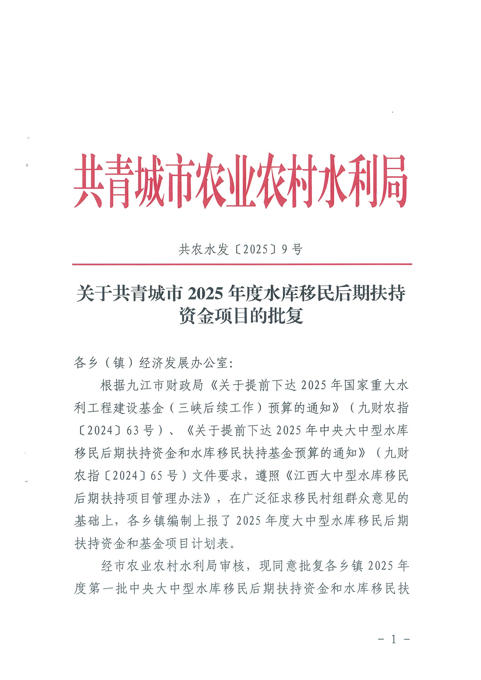 关于共青城市2025年度水库移民后期扶持资金项目的批复