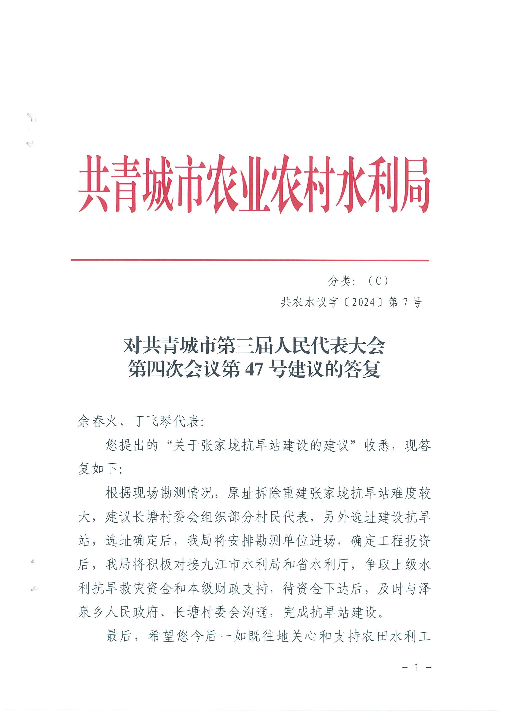 共青城市第三届人民代表大会第四次会议第47号建议的答复