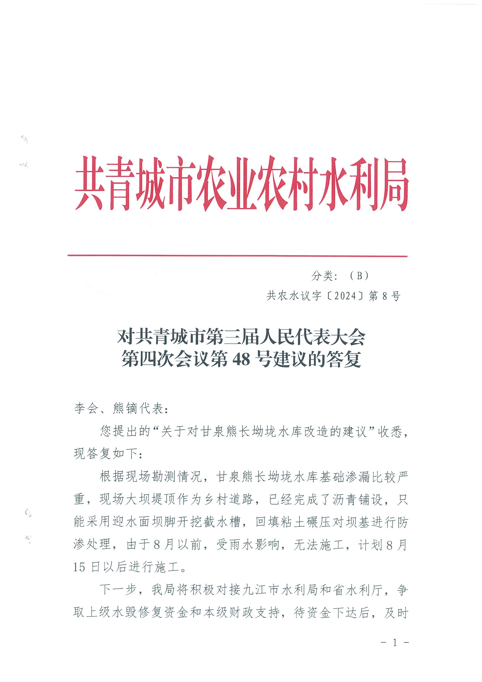 共青城市第三届人民代表大会第四次会议第48号建议的答复