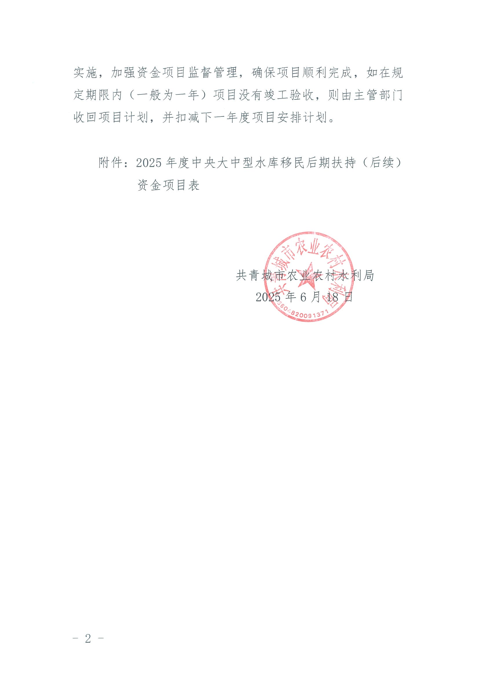关于共青城市2025年度中央大中型水库移民后期扶持资金项目(后续)的批复