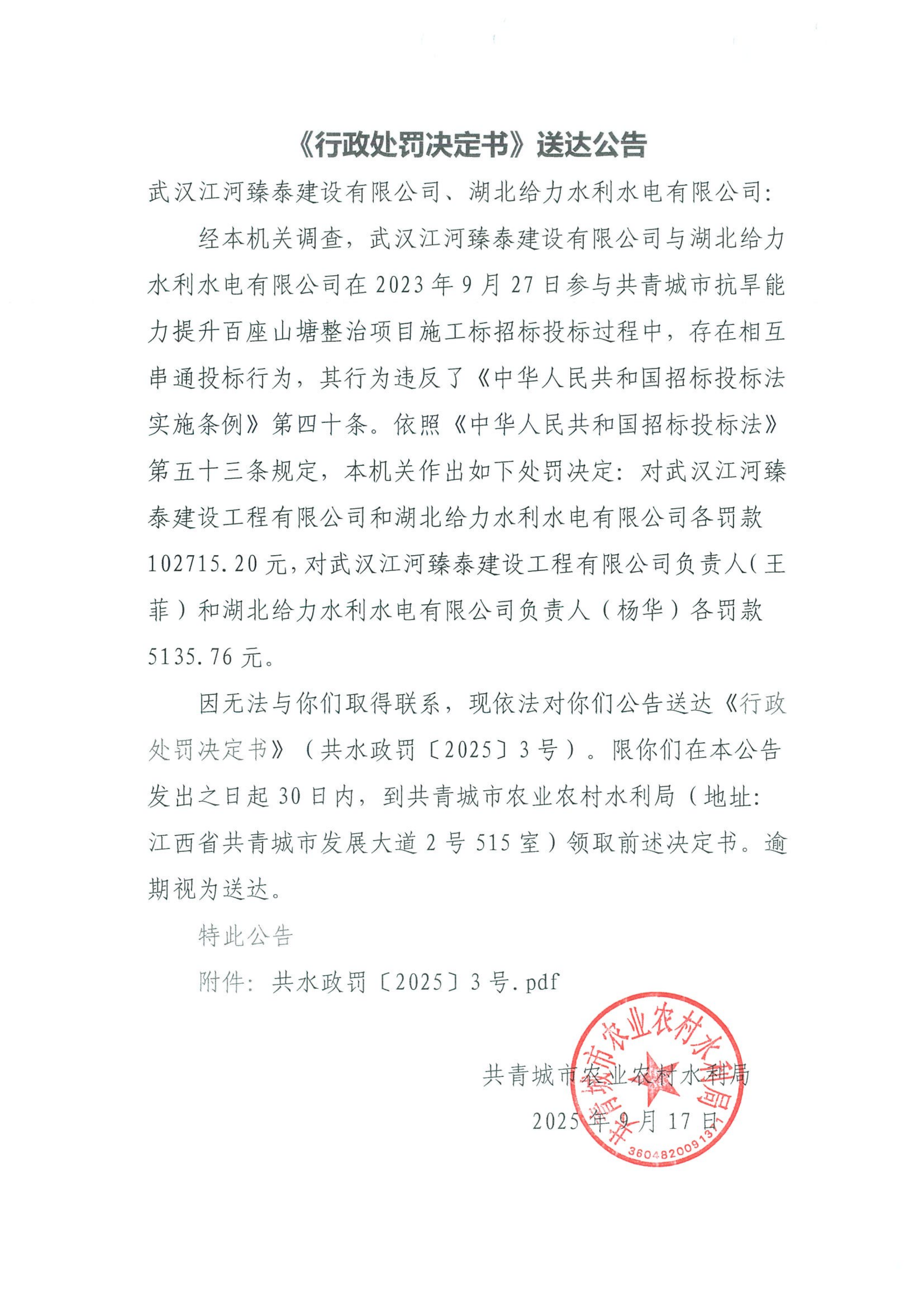 《行政处罚决定书》送达公告