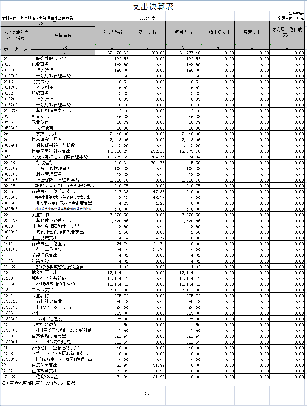 本部门2021年度支出总计 32426.32 万元,其中本年支出合计32426.32万元,较2020年增加4517.57万元,增长16.19 %,主要原因是:上级转移支付的养老保险和政府偿还失地农民挂账款直接下达到大平台;年末结转和结余 0 万元,较2020年减少715.75万元,主要原因是:财政收回结转资金。