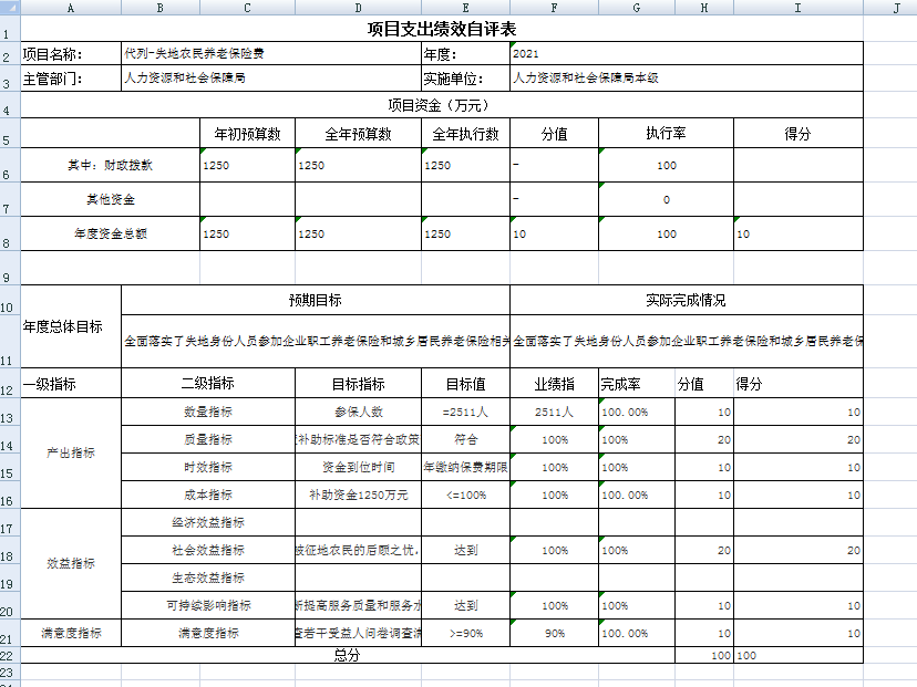 项目绩效自评总体综述:根据年初设定的绩效目标,代列-失地农民养老保险费项目绩效自评得分为 100 分。项目全年预算数为1250万元,执行数为1250万元,完成预算的100 %。项目绩效目标完成情况:一是待遇发放全部符合政策标准;二是待遇全部按时足额发放。发现的问题及原因:暂未发现问题。下一步改进措施:进一步加强绩效管理工作,进行全方位的绩效管理