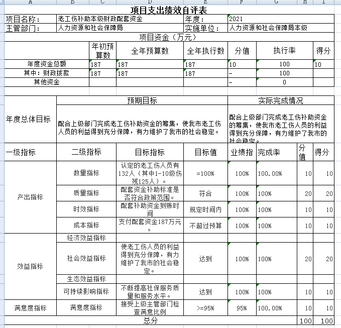 老工伤本级财政配套资金项目绩效自评得分为100分。项目全年预算数为187万元,执行数为187万元,完成预算的100 %。项目绩效目标完成情况:一是辖区内老工伤人员全部覆盖和老工伤补助本级财政配套资金按时到账;二是稳定我市社会环境和为老工伤职工提供工伤待遇保障。发现的问题及原因:暂未发现问题。下一步改进措施:进一步加强绩效管理工作,进行全方位的绩效管理。
