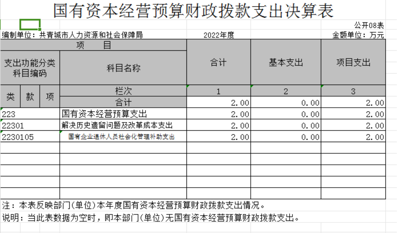(八)国有资本预算支出年初预算数为0万元,决算数为2.00万元,主要原因是:上级资金下达。