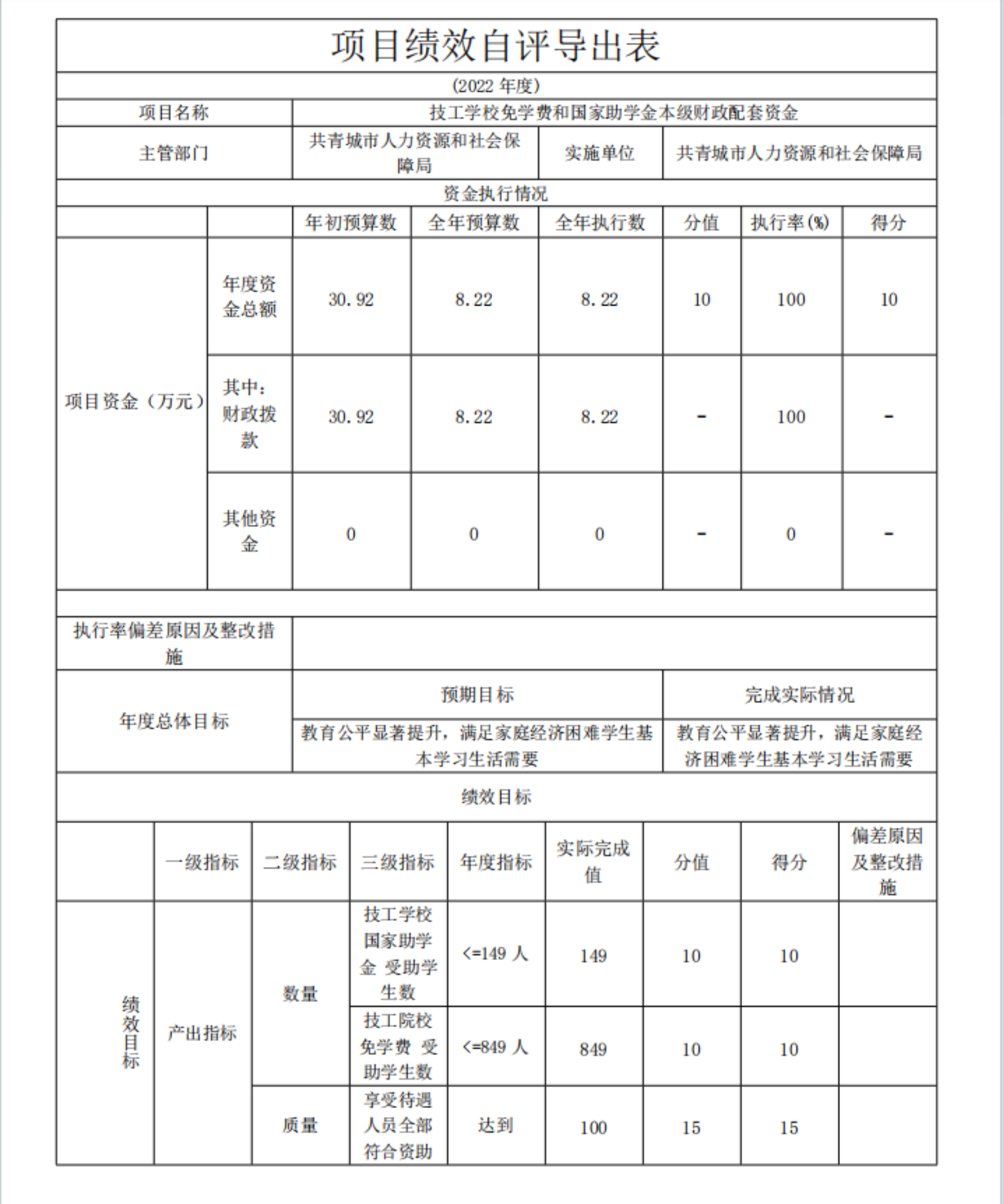 项目绩效自评总体综述:根据年初设定的绩效目标,技工学校免学费和国家助学金本级财政配套资金项目绩效自评得分为100分。项目全年预算数为8.22万元,执行数为8.22万元,完成预算的100%。项目绩效目标完成情况:一是享受免学费和助学金的学生全部符合资助政策;二是各项待遇全部在规定时间内发放到位。发现的问题及原因:暂未发现问题;下一步改进措施:进一步加强绩效管理工作,进行全方位的绩效管理。