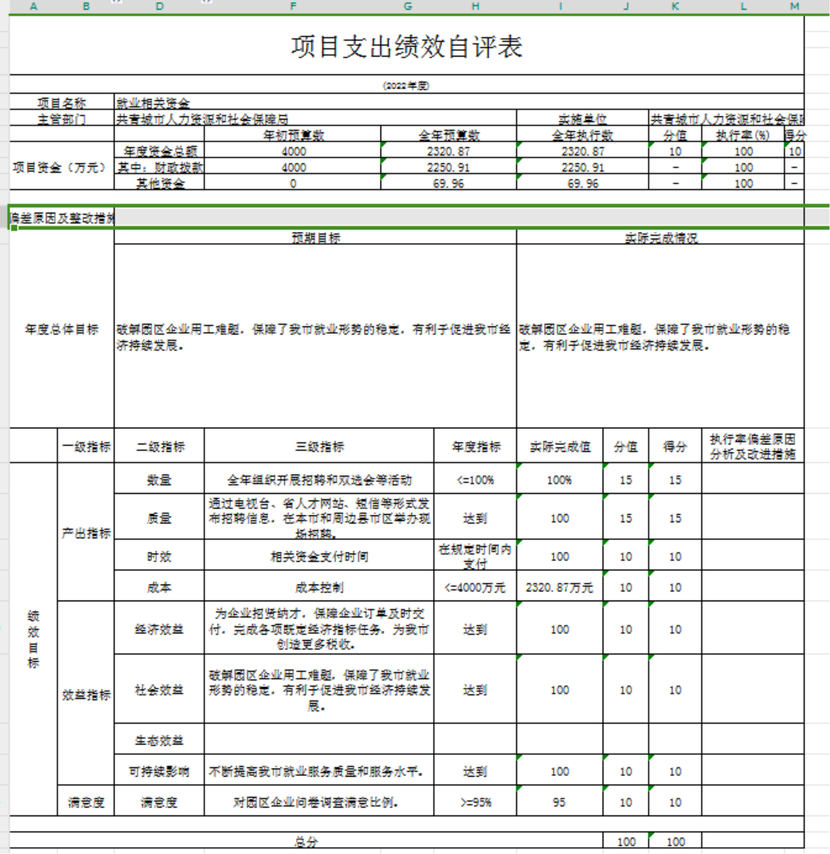 就业相关资金项目绩效自评得分为100分。项目全年预算数为2320.87万元,执行数为2320.87万元,完成预算的100%。项目绩效目标完成情况:一是按时开展招聘活动;二是破解园区企业用工难题,保障了我市就业形势的稳定,促进了我市经济持续发展。发现的问题及原因:绩效指标设定不合理、不够细化;下一步改进措施:进一步加强绩效管理工作,更加合理的设定绩效指标。进行全方位的绩效管理。