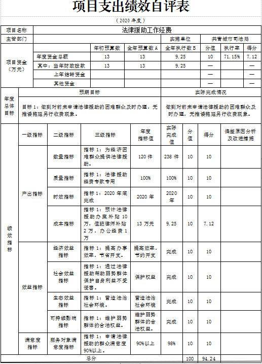 1.法律援助工作经费自评得94.24分,项目全年预算数13万元,执行数9.25万元,完成预算的71.15%。项目绩效目标完成情况:部分工作需跨年度完成,剩余资金需到次年支付;