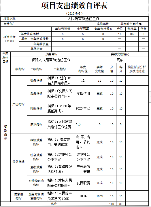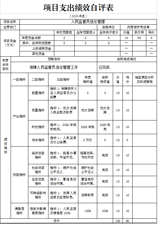 2.人民监督员选任管理工作经费自评得80分,项目全年预算数2万元,执行数2万元,未完成预算。项目绩效目标完成情况:2020年未开展此工作;
