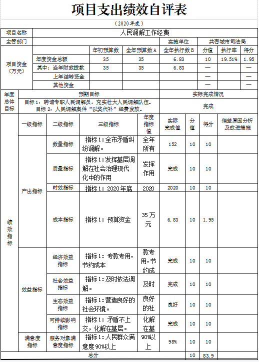 4.人民调解工作经费自评得100分,项目全年预算数35万元,执行数6.83万元,完成预算的19.51%。项目绩效目标完成情况:疫情影响,部分工作未及时开展,造成资金未使用完毕;