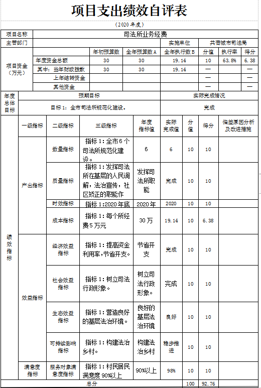 5.司法所业务经费自评得92.76分,项目全年预算数30万元,执行数19.14万元,完成预算的63.80%。项目绩效目标完成情况:疫情影响,部分工作未及时开展,造成资金未使用完毕;