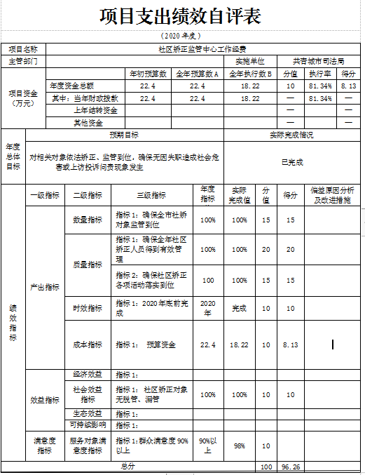 6.社区矫正监管中心工作经费自评得96.26分,项目全年预算22.4万元,执行数18.22万元,完成预算的81.34%。项目绩效目标完成情况:疫情影响,部分工作未及时开展,造成资金未使用完毕;