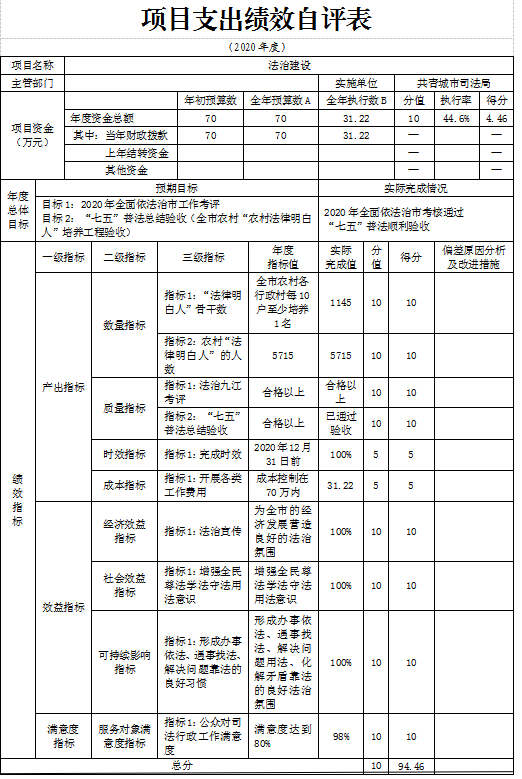 7.法治建设工作经费自评得94.46分,项目全年预算数70万元,执行数31.22万元,完成预算的44.60%。项目绩效目标完成情况:疫情影响,部分工作未及时开展,造成资金未使用完毕;