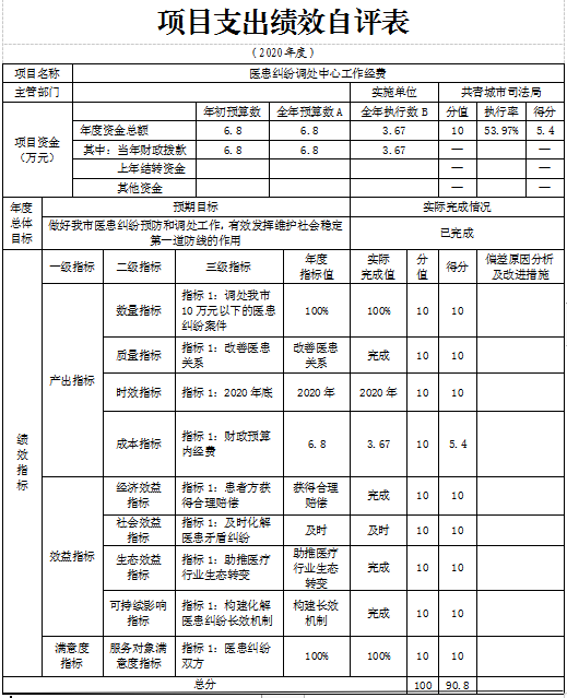 8.医患纠纷调处中心工作经费自评得90.80分,项目全年预算数6.8万元,执行数3.67万元,完成预算的53.97%。项目绩效目标完成情况:疫情影响,部分工作未及时开展,造成资金未使用完毕;