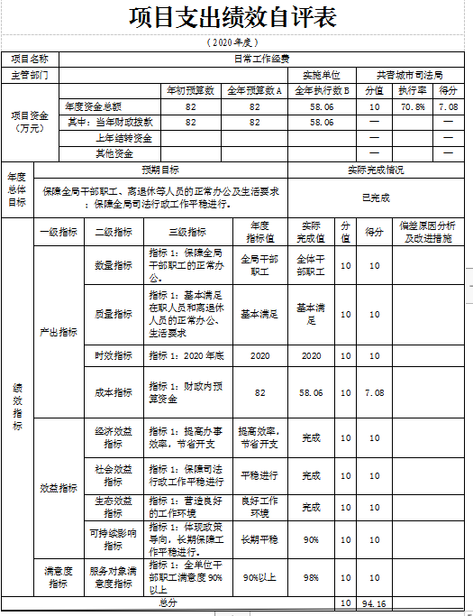 9.日常工作经费自评得94.16分,项目全年预算数82万元,执行数58.06万元,完成预算的70.8%。项目绩效目标完成情况:疫情影响,部分工作未及时开展,造成资金未使用完毕;