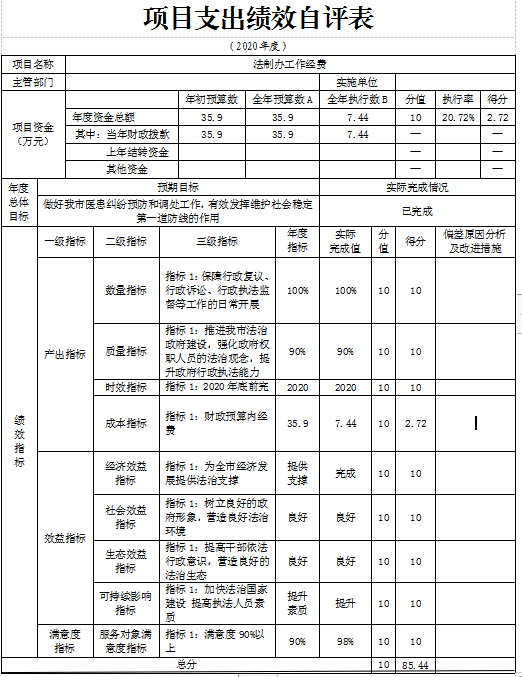 10.法制办工作经费自评得85.44分,项目全年预算数35.9万元,执行数7.44万元,完成预算的20.72%。项目绩效目标完成情况:疫情影响,部分工作未及时开展,造成资金未使用完毕;
