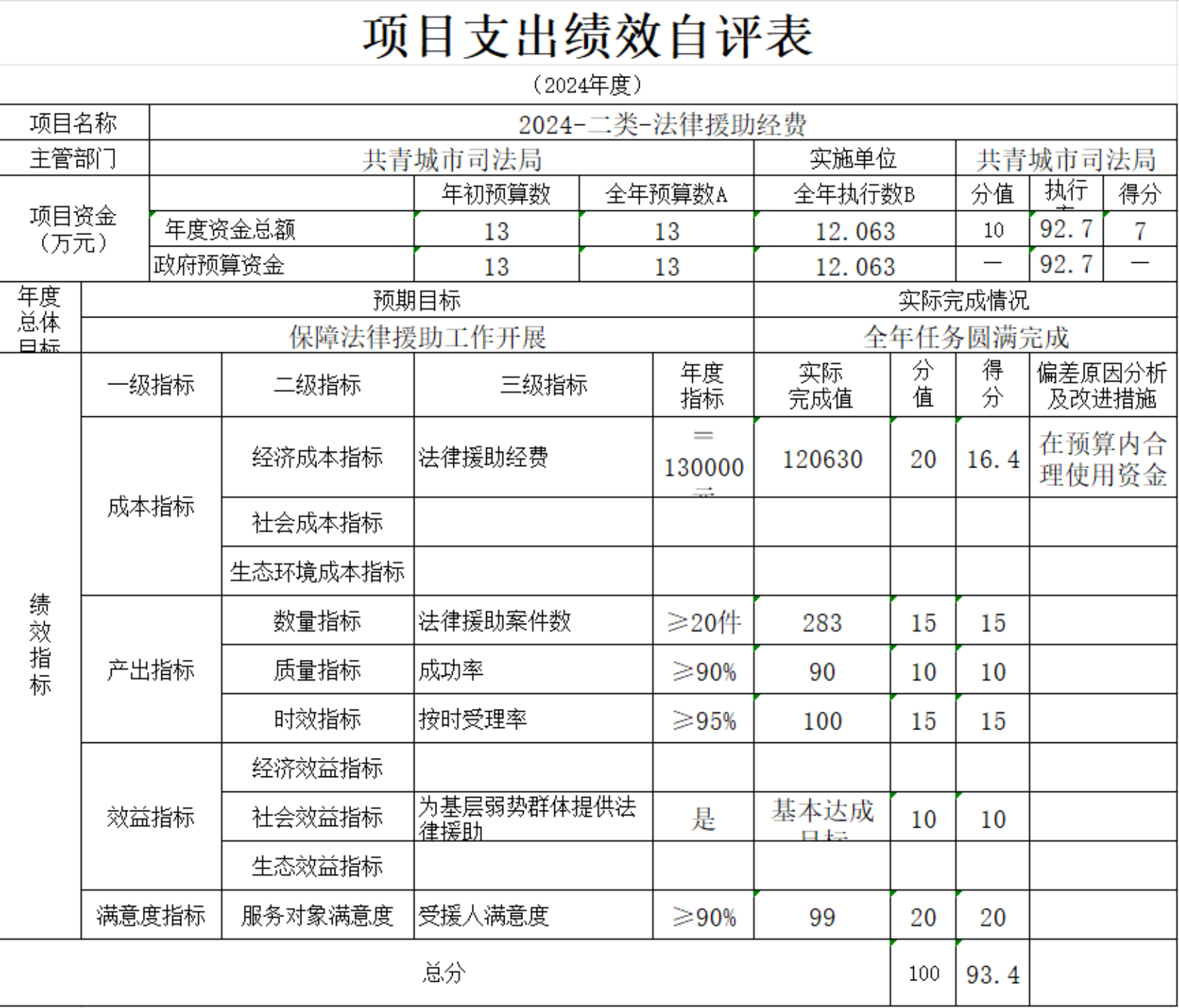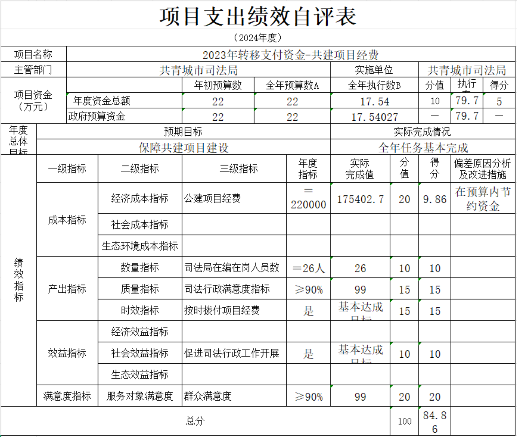 共青城市司法局(本级)“一类-日常工作经费”“二类-法律援助经费”等23个项目支出绩效自评结果如下: