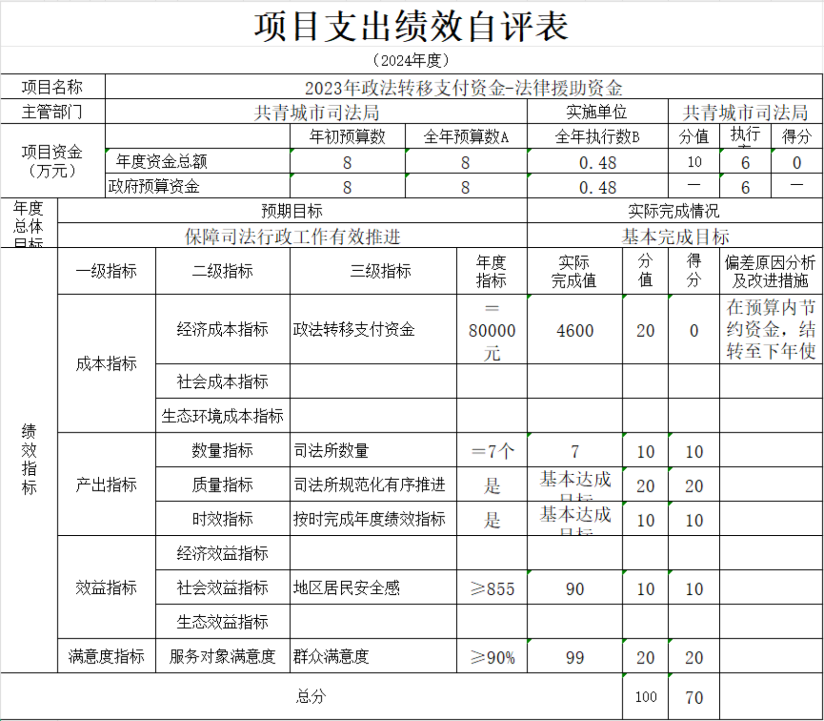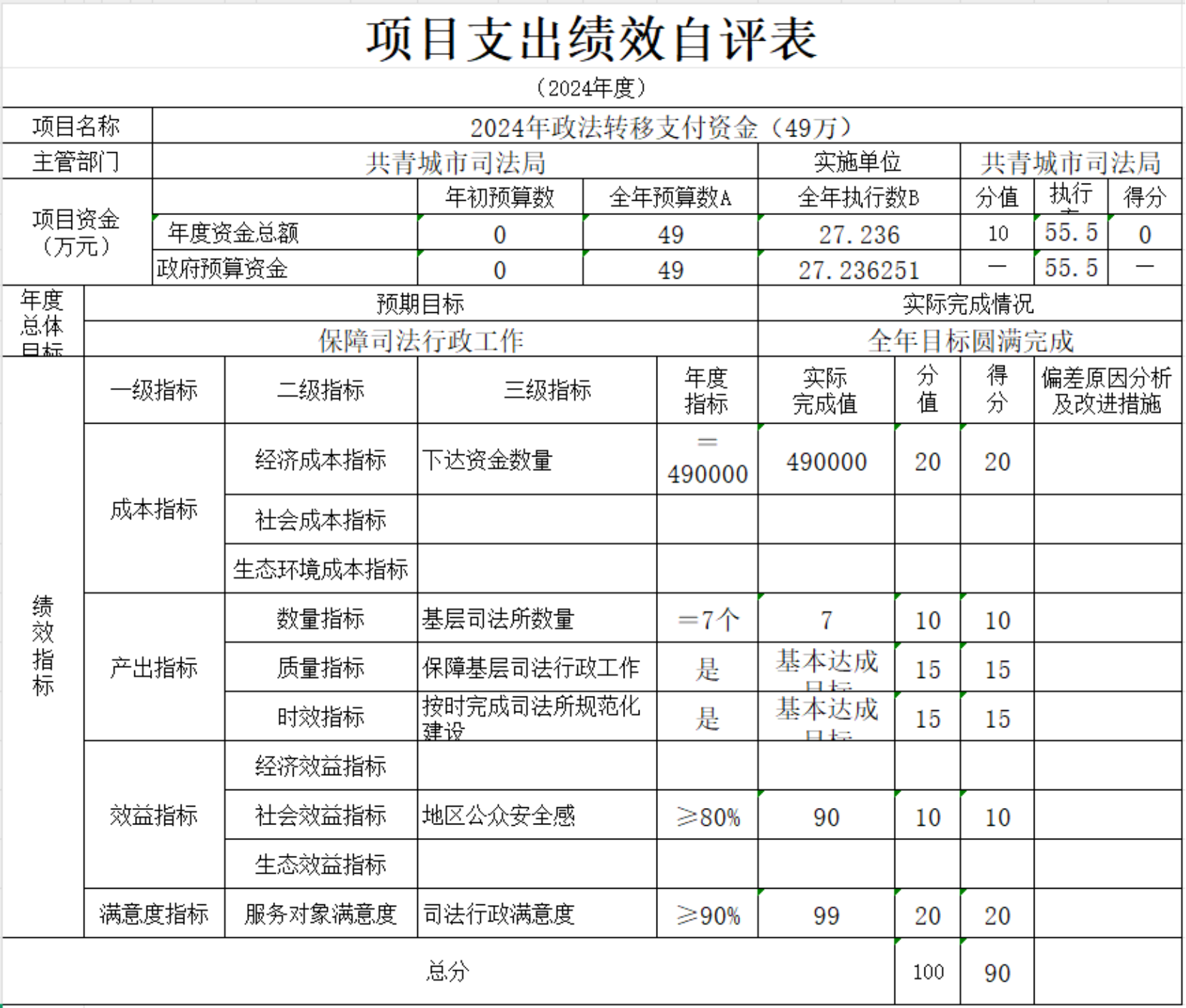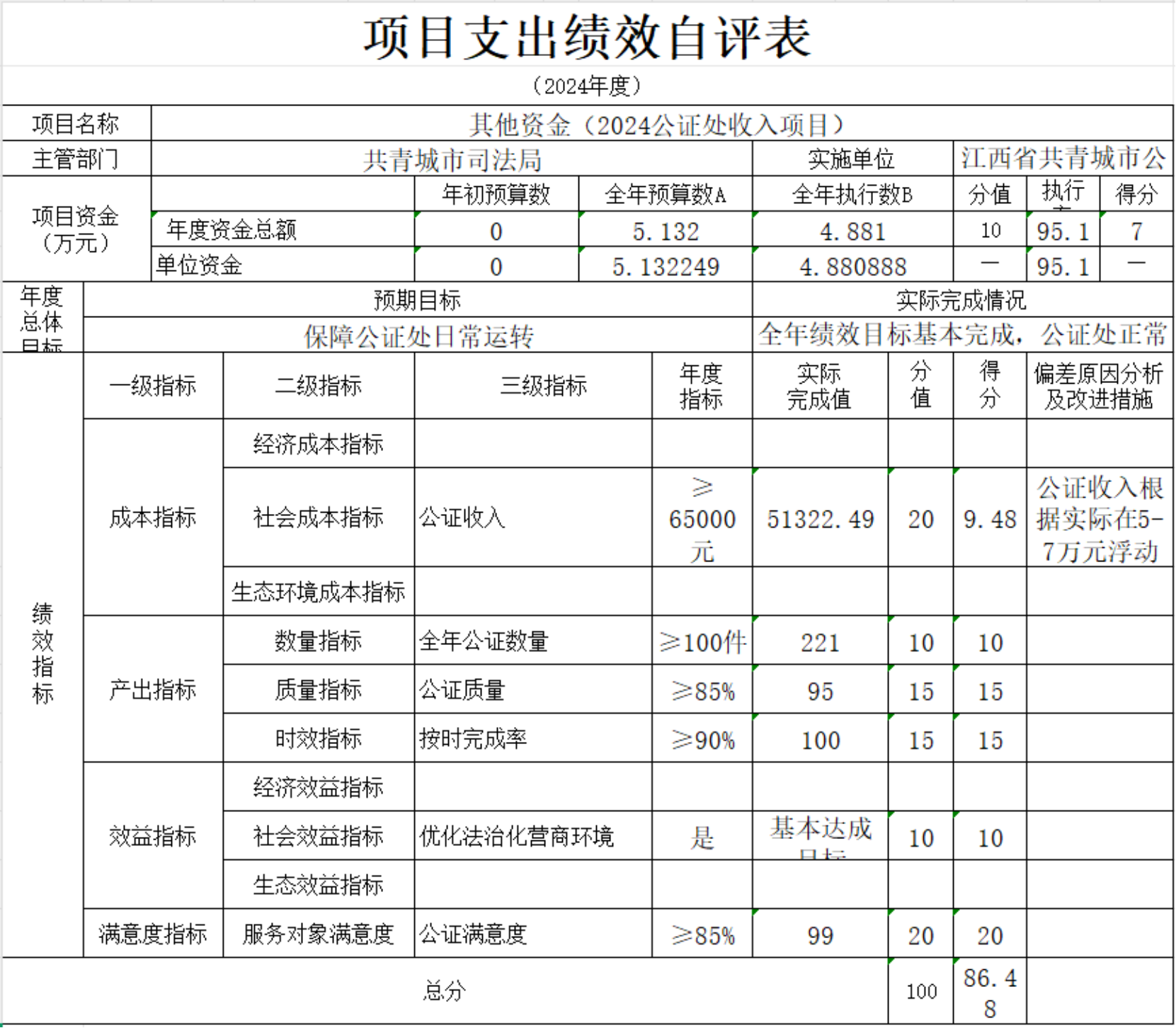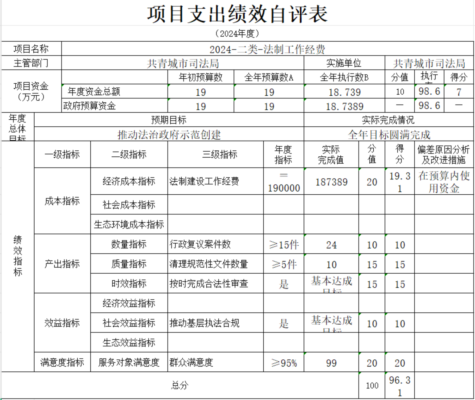 单位自评工作开展情况:2024年度共青城市司法局按照有关规定,及时展开了单位绩效自评工作,从预算执行率、产出、效益、满意度,项目绩效自评表、自评报告等方面,严格规范预算单位自评依据及流程,开展绩效评价的23个项目基本实现了2024年度的总体目标,全年项目预算资金使用合规。