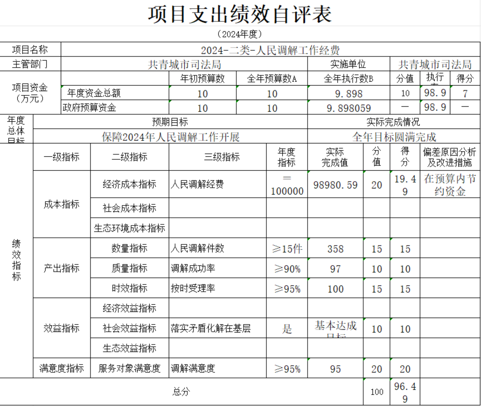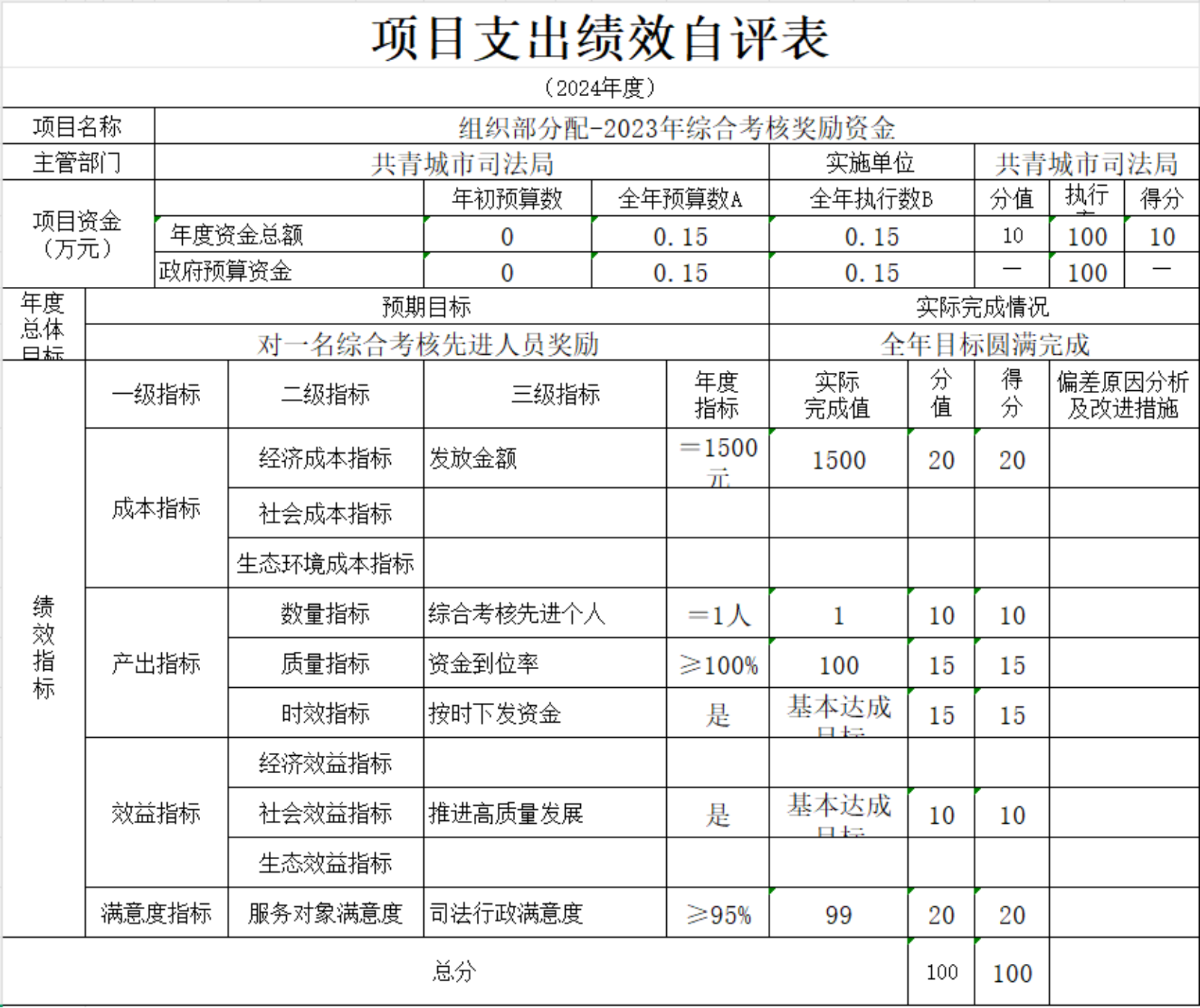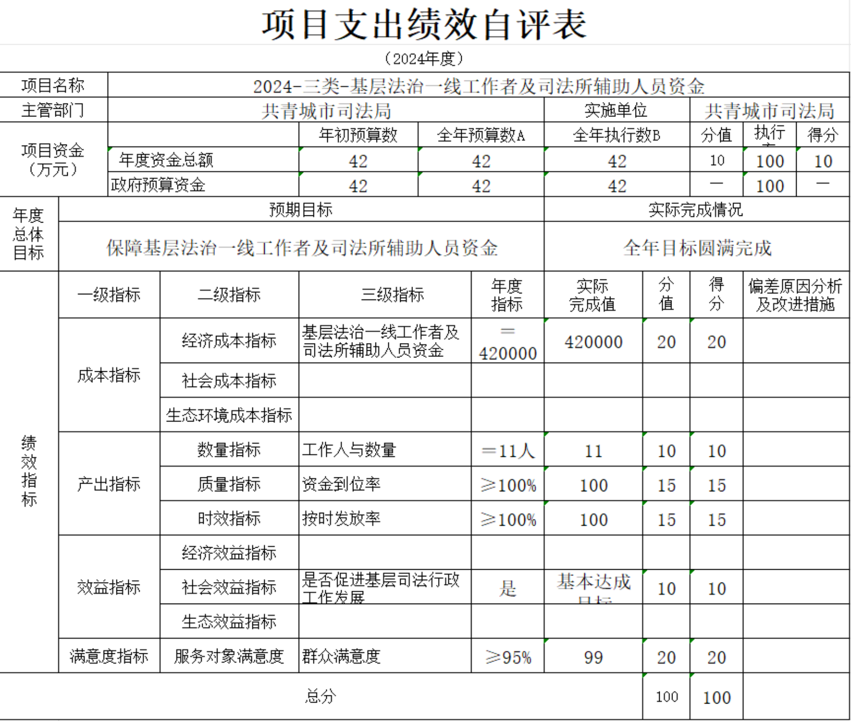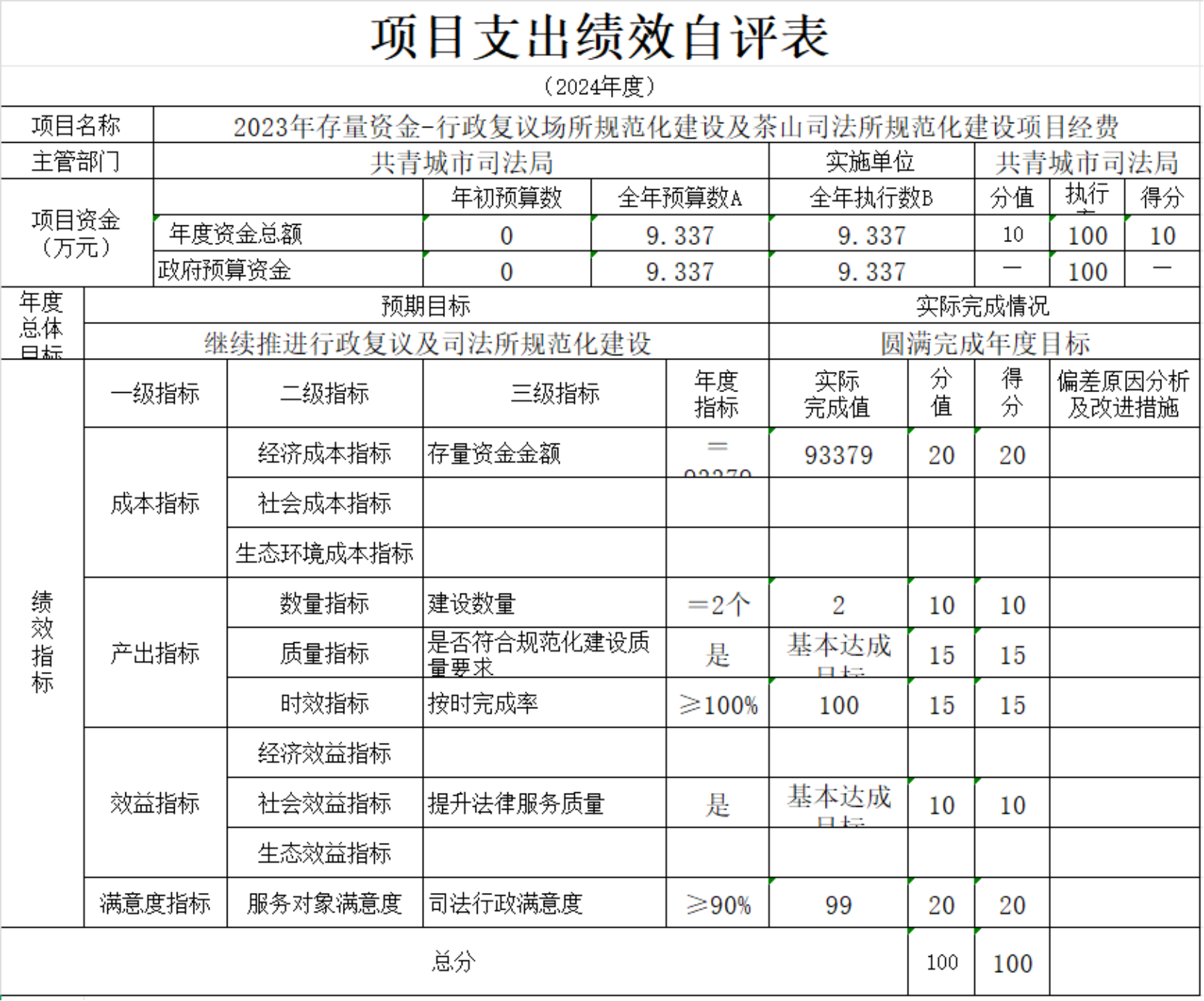 单位自评工作开展情况:2024年度共青城市司法局按照有关规定,及时展开了单位绩效自评工作,从预算执行率、产出、效益、满意度,项目绩效自评表、自评报告等方面,严格规范预算单位自评依据及流程,开展绩效评价的23个项目基本实现了2024年度的总体目标,全年项目预算资金使用合规。