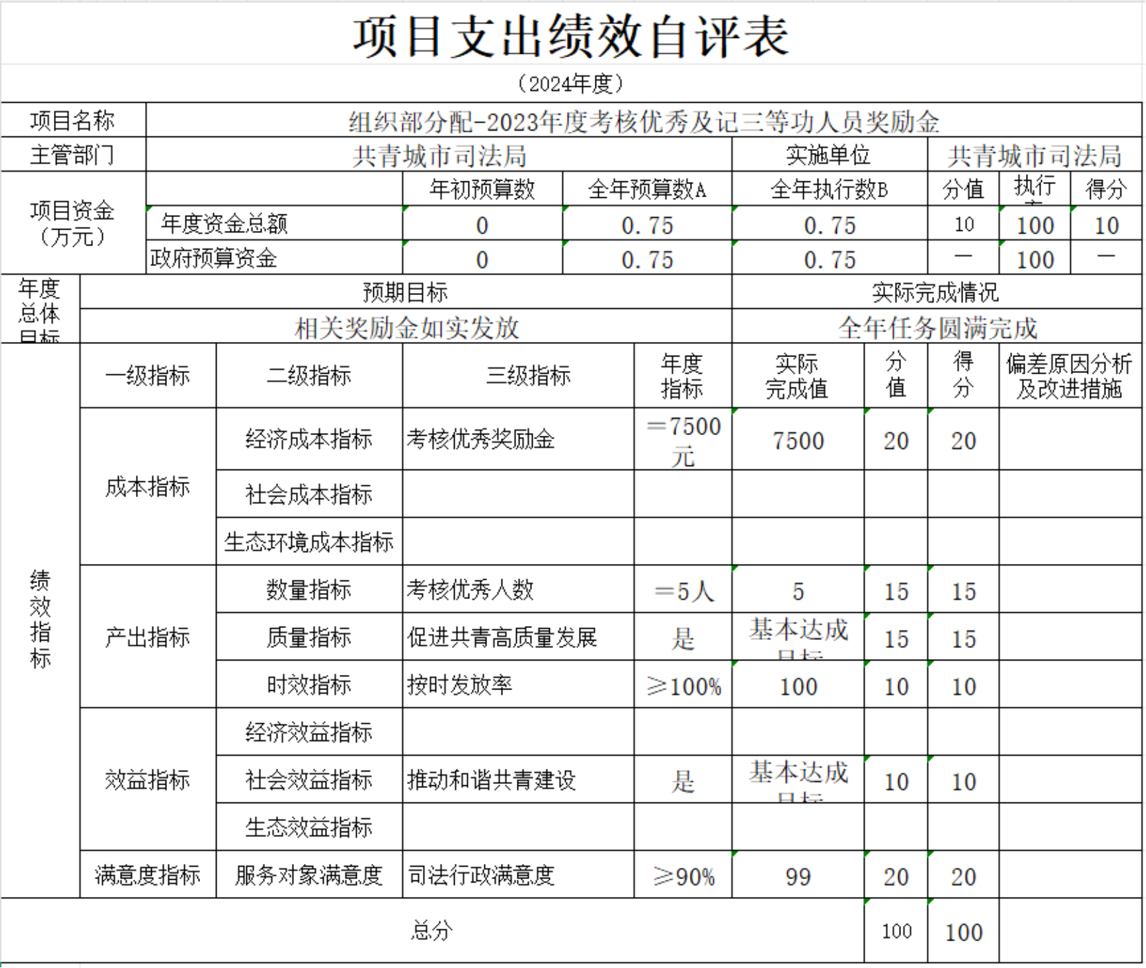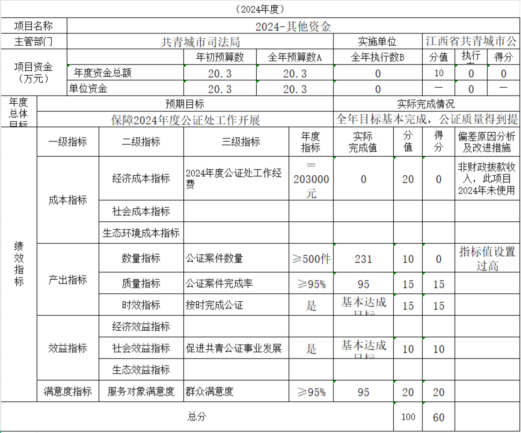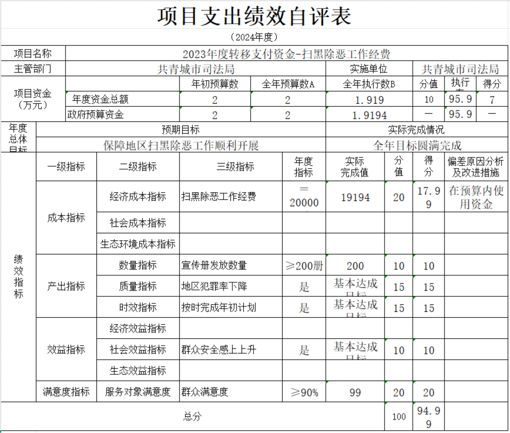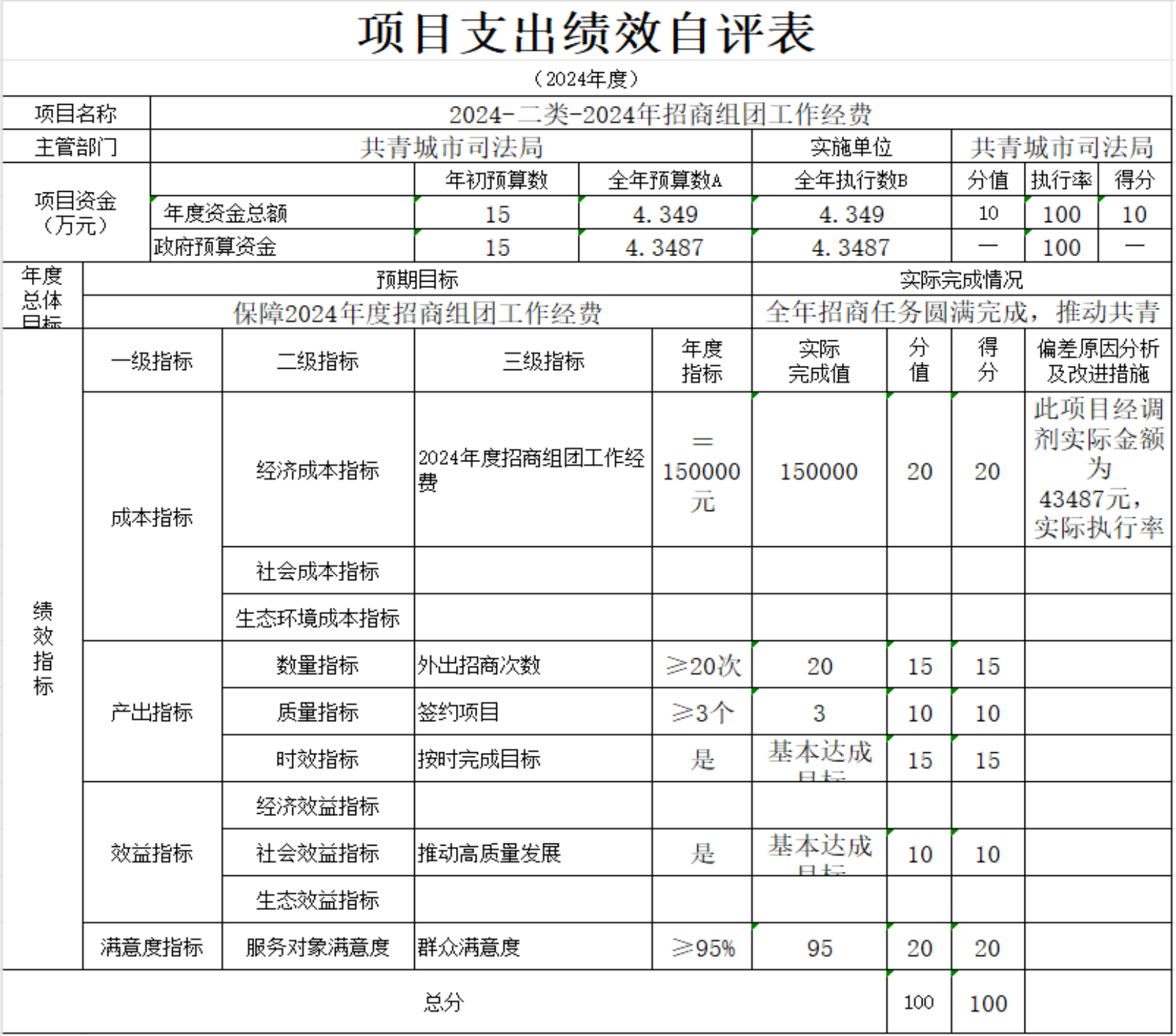 单位自评工作开展情况:2024年度共青城市司法局按照有关规定,及时展开了单位绩效自评工作,从预算执行率、产出、效益、满意度,项目绩效自评表、自评报告等方面,严格规范预算单位自评依据及流程,开展绩效评价的23个项目基本实现了2024年度的总体目标,全年项目预算资金使用合规。
