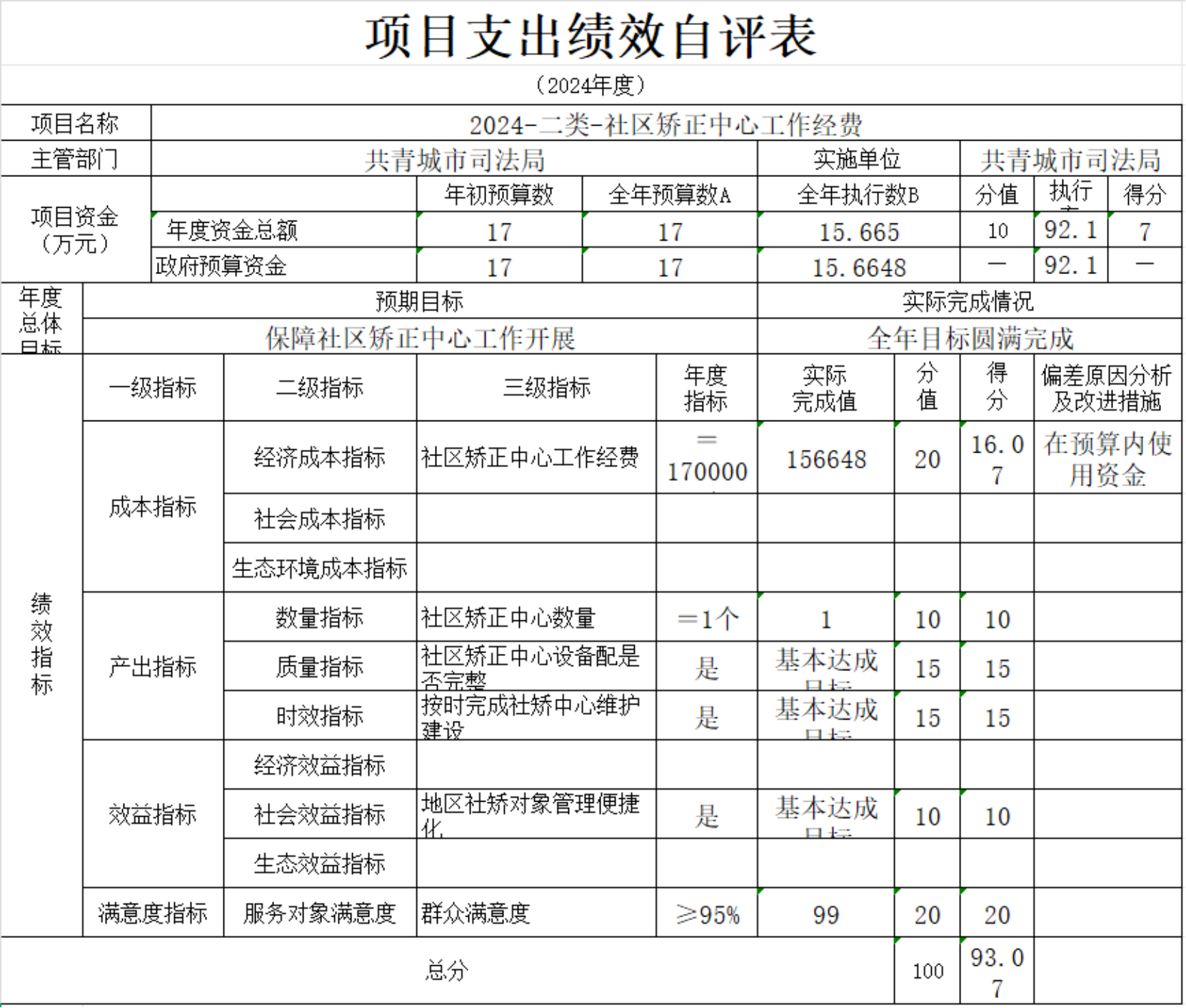 共青城市司法局社区矫正中心工作经费项目完成情况较好,全年预算数为17万元,执行数为15.67万元,保障了基层司法行政工作正常展开,项目绩效得分为95分。
