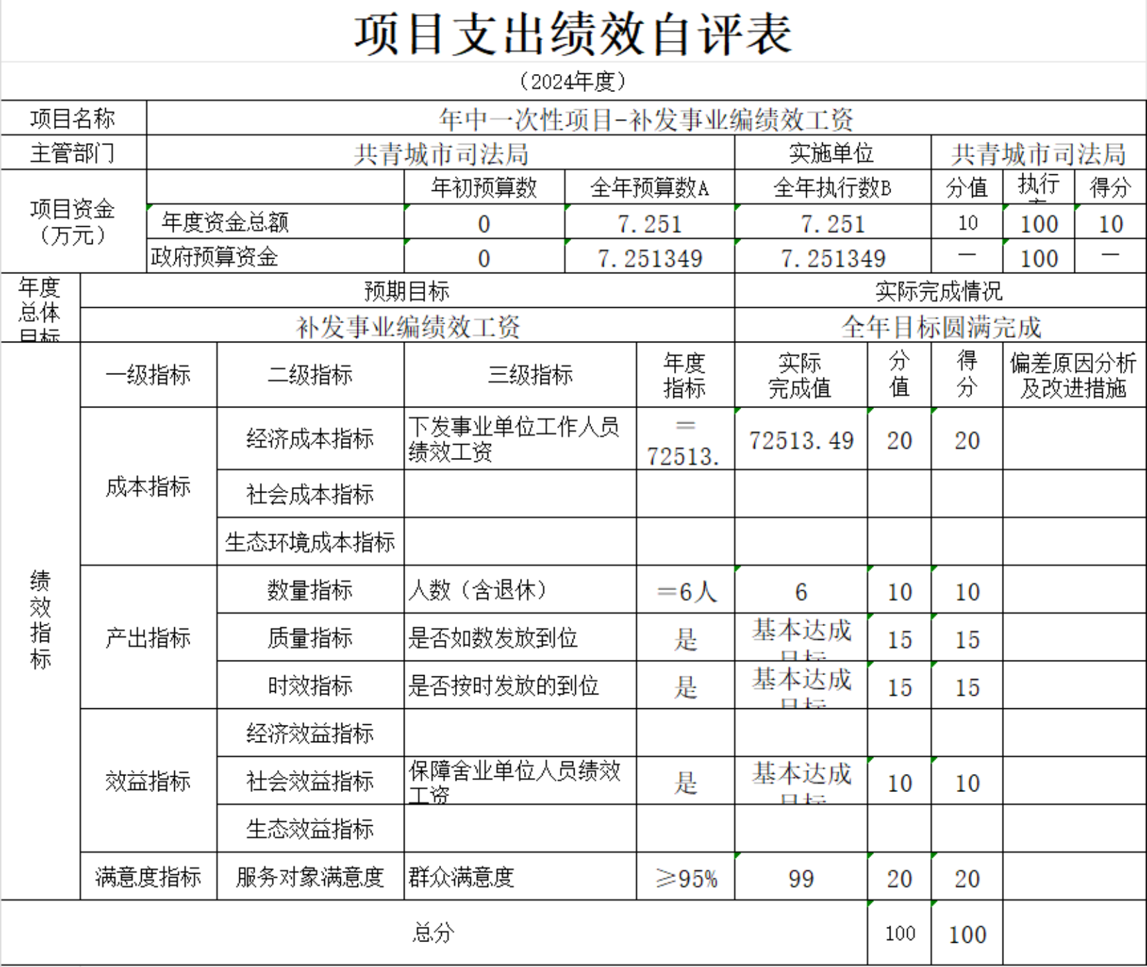 18、年中一次性项目-补发事业编绩效工资全年预算资金7.25万元,实际支出7.25万元。