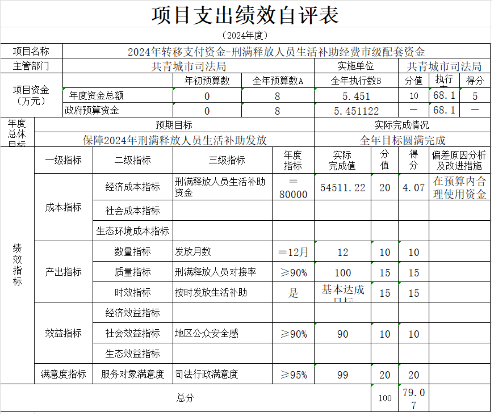 17、2024年转移支付资金-刑满释放人员生活补助经费市级配套资金全年预算资金8万元,实际支出5.45万元。