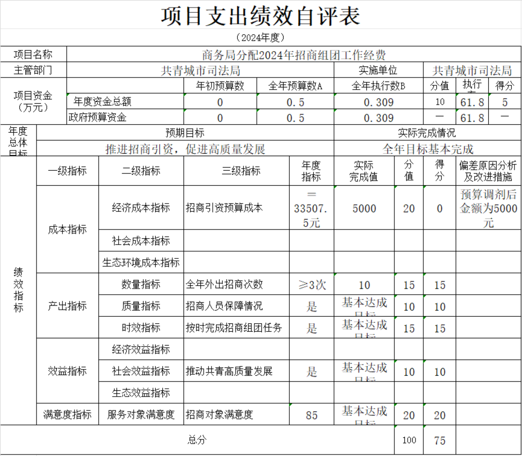 21、商务局分配2024年招商组团工作经费全年预算资金0.5万元,实际支出0.31万元。