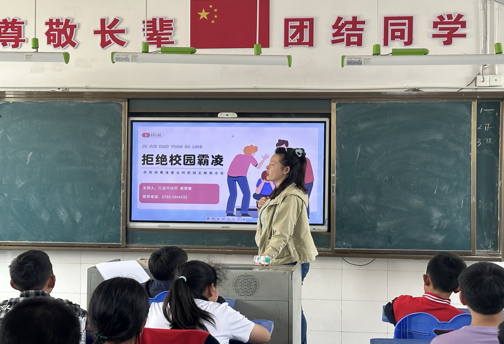 为进一步提升学生防溺水及校园安全意识,4月8日下午共青城市司法局江益司法所走进江益镇中心小学,为同学们带去一场内容丰富、生动有趣的防溺水及拒绝校园霸凌的法治课。