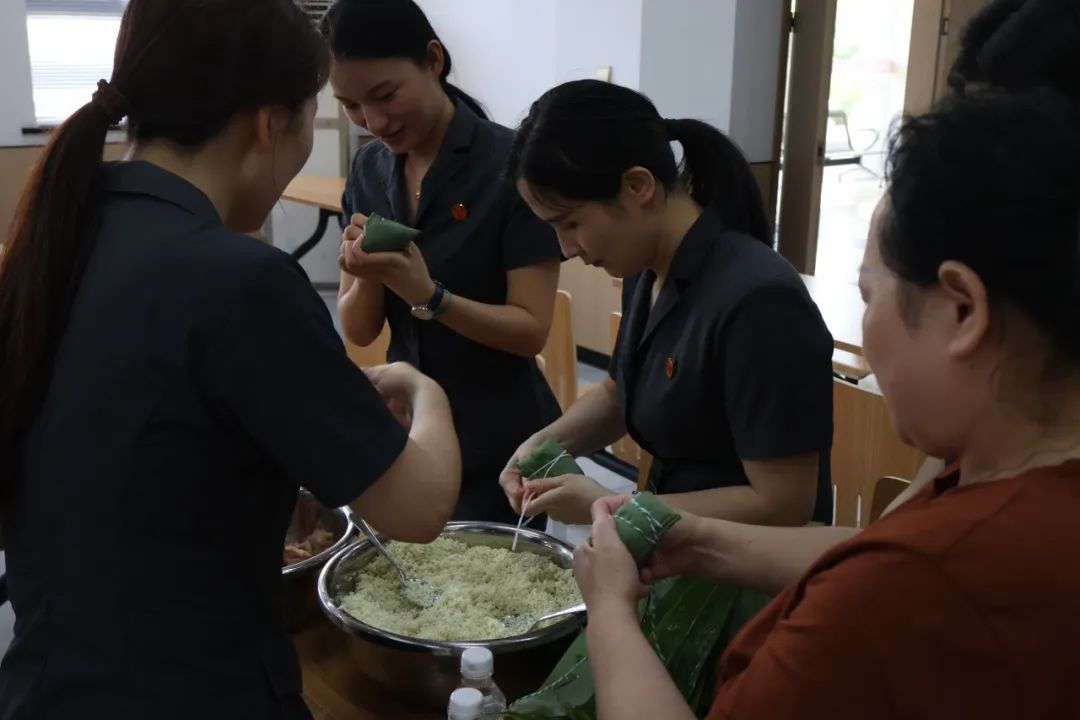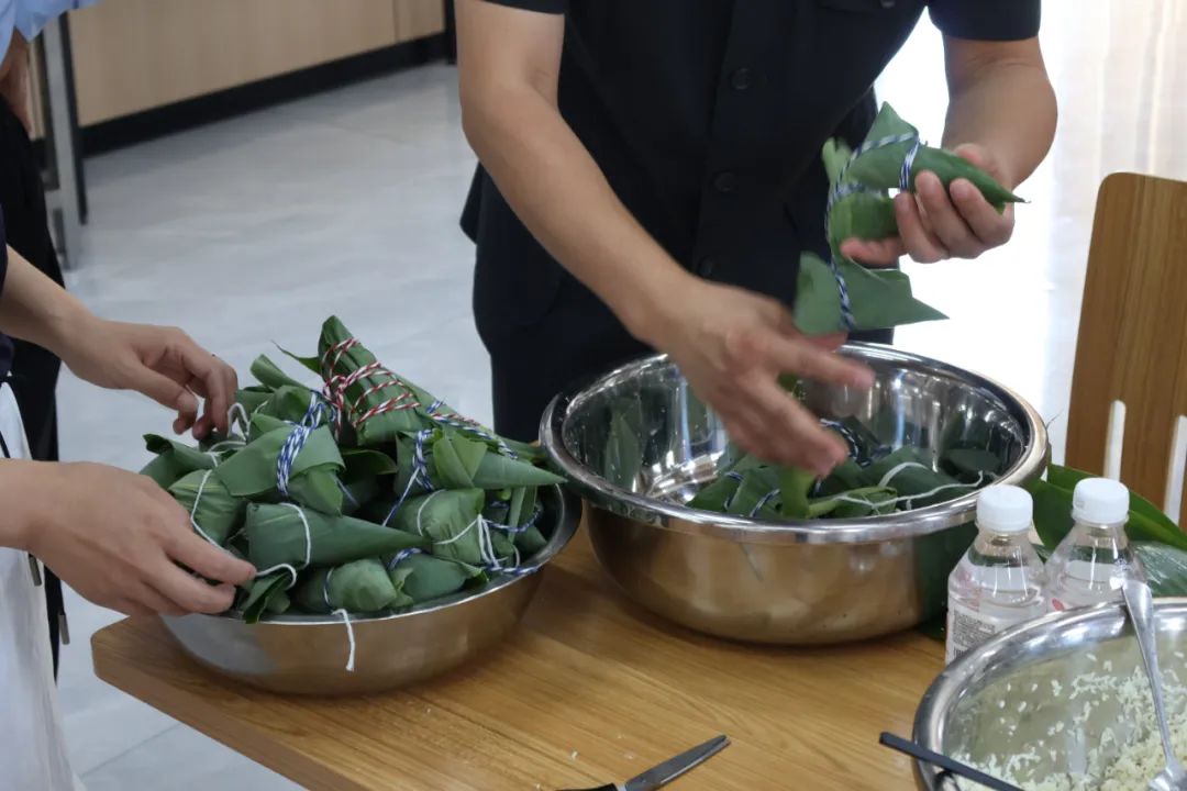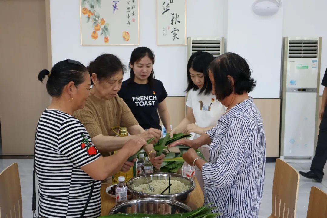 在包粽子环节,活动贴心准备了糯米、粽叶、红枣等丰富食材,党员与居民们围桌而坐,纷纷展露身手。捋粽叶、卷成漏斗状、填入糯米、压实馅料、封口扎捆,动作一气呵成。鲜嫩的粽叶在指尖上下翻飞,不多时,一只只形态各异的粽子便整齐排列开来,串起了大家满满的热情。整个活动现场一片欢声笑语,气氛和谐。
