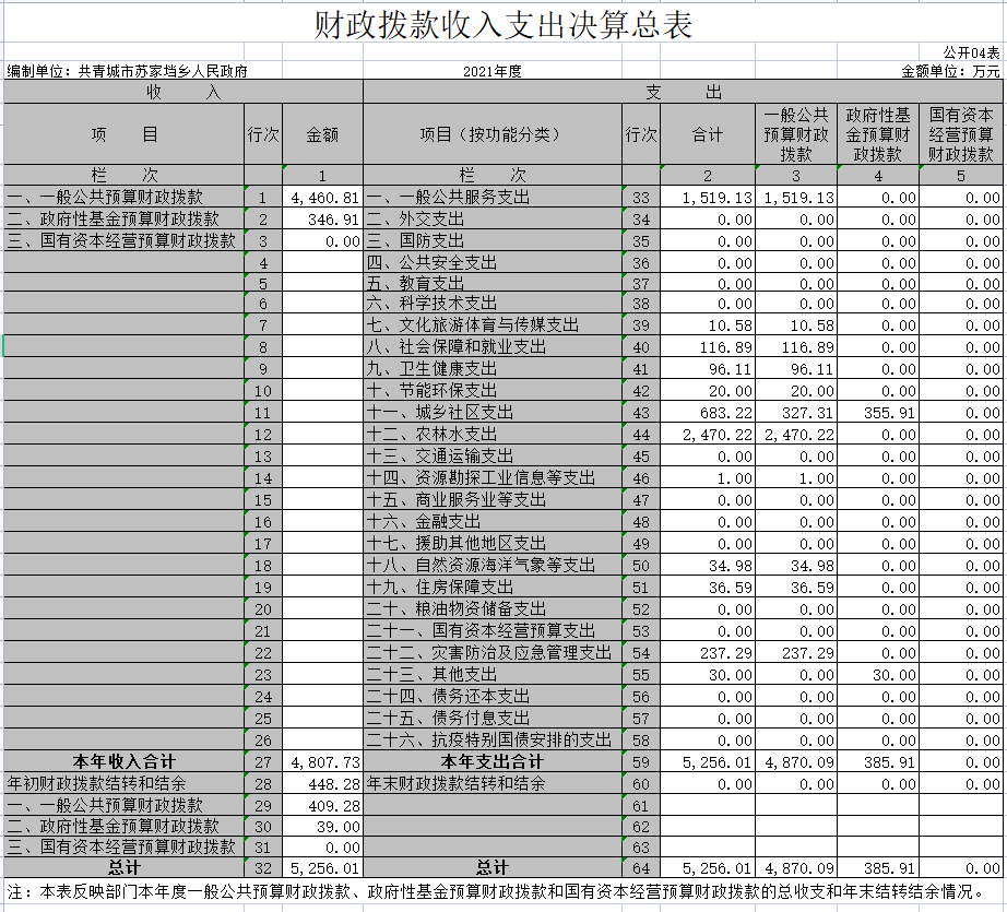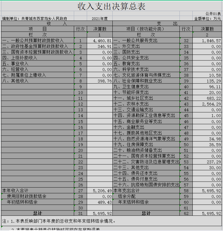 本部门2021年度收入总计5695.92万元,其中年初结转和结余489.43万元,较2020年减少2375.28 万元,下降29.43 %;本年收入合计5206.49万元,较2020年减少1869.56万元,下降26.42%,主要原因是:2021年度本年收入减少1869.57万元,下降26.42%;年初结转和结余较2020年减少505.72万元,下降50.82%。