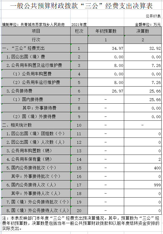 (三)公务用车购置及运行维护费支出7.26万元,其中公务用车购置年初预算数为0万元,决算数为 0万元,决算数较2020年增加(减少) 0 万元,主要原因是全年公务用车购置0万元,全年购置公务用车 0 辆。决算数较年初预算数持平的主要原因是:当年未购置公务用车;公务用车运行维护费支出年初预算数为8万元,决算数为7.26万元,完成预算的90.75%,决算数较2020年减少0.76万元,下降9.48%,主要原因是加强公务用车管理,减少不必要出车,年末公务用车保有2辆。决算数较年初预算数持平的主要原因是:2021年度未新增公务车辆。