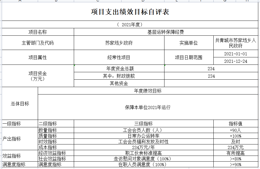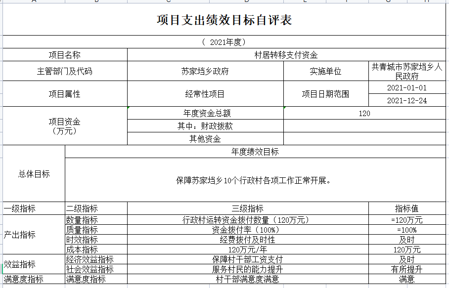 项目全年预算数为120万元,执行数为120万元,完成预算的100%。项目绩效目标完成情况:一是保障村两委正常运转;二是保障社会公益性建设。