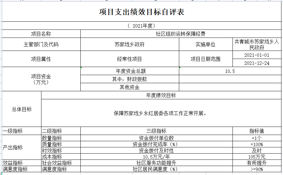 社区组织运转保障经费项目绩效自评总体综述:根据年初设定的绩效目标,社区组织运转保障经费项目绩效自评得分为100分。项目全年预算数为10.5万元,执行数为10.5万元,完成预算的100%。项目绩效目标完成情况:一是保障永红社区两委正常运转;二是保障社会公益性建设。