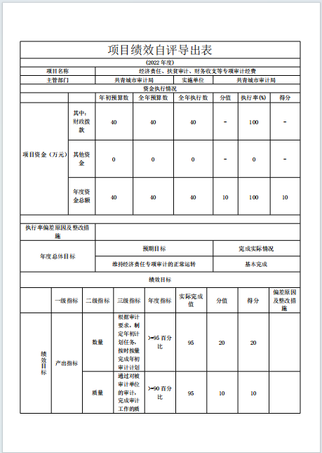 经济责任及财务收支专项审计经费项目绩效自评综述:根据年初设定的绩效目标,经济责任及财务收支专项审计经费项目绩效自评得分为100分。项目全年预算数为40万元,执行数为40万元,完成预算的100%。主要产出和效果:一是保障了审计项目顺利进行;二是控制在预算范围内。
